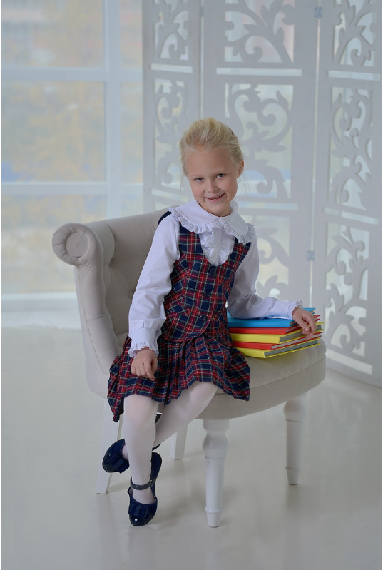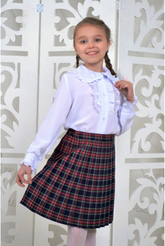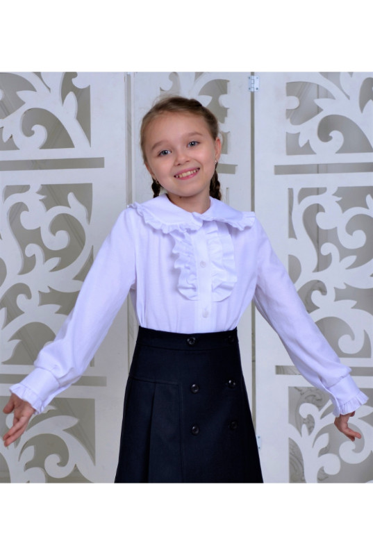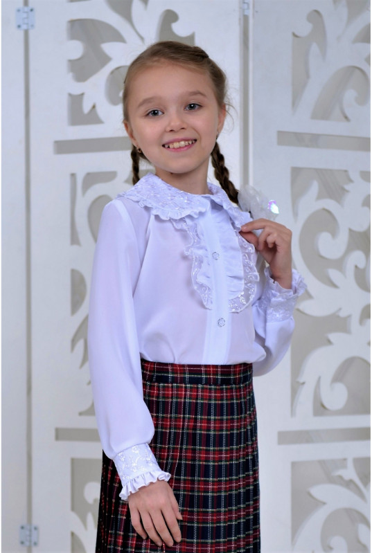 Блузка для девочек прямого силуэта с длинными рукавами, с большим отложным воротником из ажура. Рукава украшены ажурной вставкой. Блузка застёгивается на пуговицы.