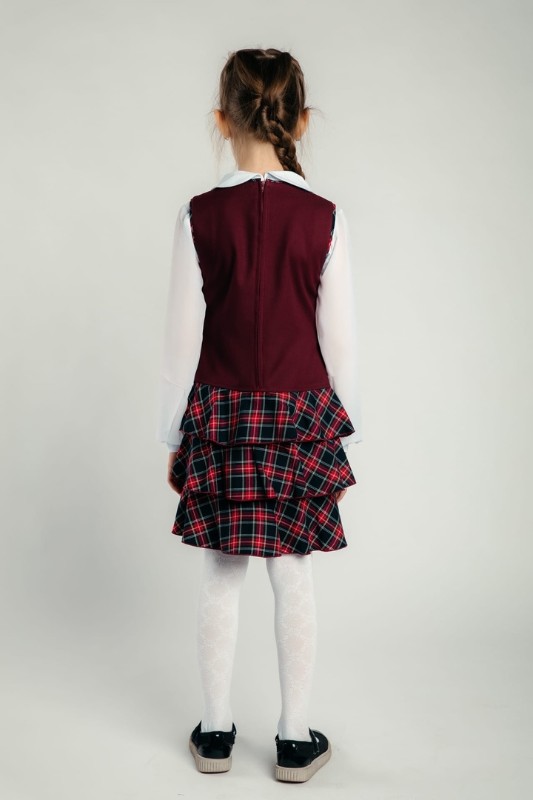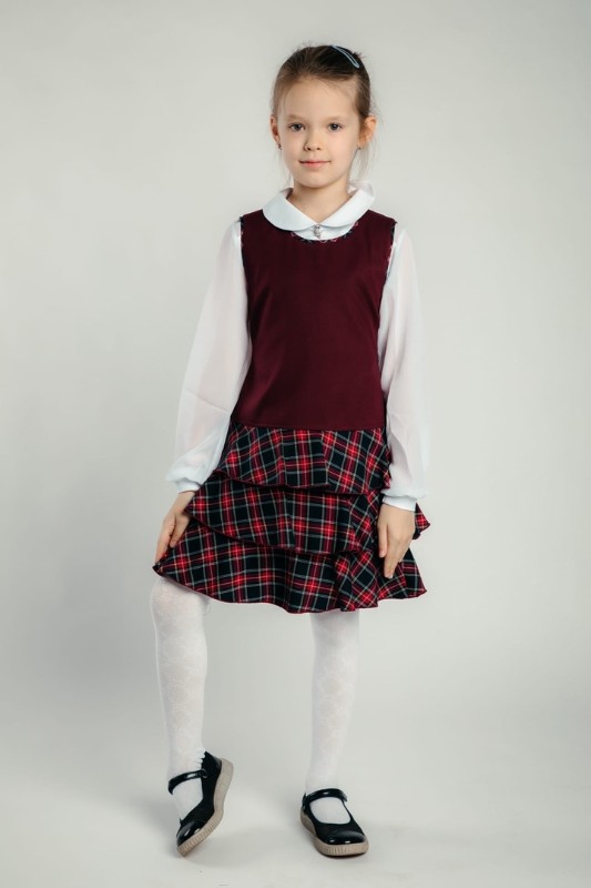 Сарафан «Мэри» для девочек младшей и средней школы полуприлегающего силуэта, с застёжкой сзади на молнии. Модель с заниженной талией и ярусной юбкой. Изделие изготавливается из поливискозной ткани. Размер 128-158